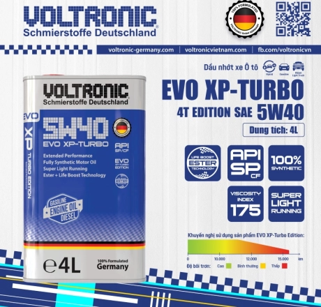 VOLTRONIC EVO XP-TURBO 4T EDITION SAE 5W40 là dầu động cơ tổng hợp 100% có hiệu suất cao dựa trên công nghệ phụ gia Lifeboost và Esterboost từ Voltronic GmbH (Đức) giúp xe ổn định hơn khi chạy đường dài, giảm lượng tiêu hao nhiên liệu, chống mài mòn động cơ. Với công thức cải tiến và phụ gia đặc biệt còn làm tăng khả năng bảo vệ động cơ, đem lại hiệu suất tối đa trong mọi điều kiện vận hành.