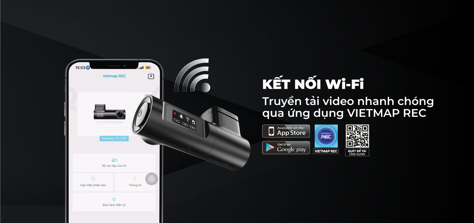 Camera VIETMAP C1 được trang bị công nghệ truyền dữ liệu thông qua kết nối WIFI không dây, giúp việc xem lại, lưu trữ chia sẻ video lên mạng xã hội dễ dàng trên các thiết bị hệ điều hành Android và IOS thông qua ứng dụng VIETMAP REC.