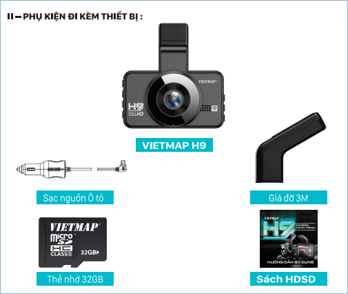 | Phụ kiện kèm theo | - Máy VIETMAP H9S - Giá đỡ 3M - Sạc nguồn ô tô - Thẻ nhớ 32GB Class 10 - Sách HDSD |