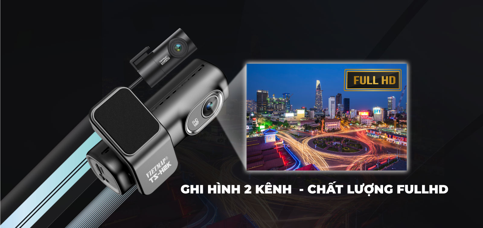 VIETMAP TS-H2K Camera hành trình với ống kính ghi hình góc rộng, chất lượng Full HD 1080p ở cả kênh trước và sau.