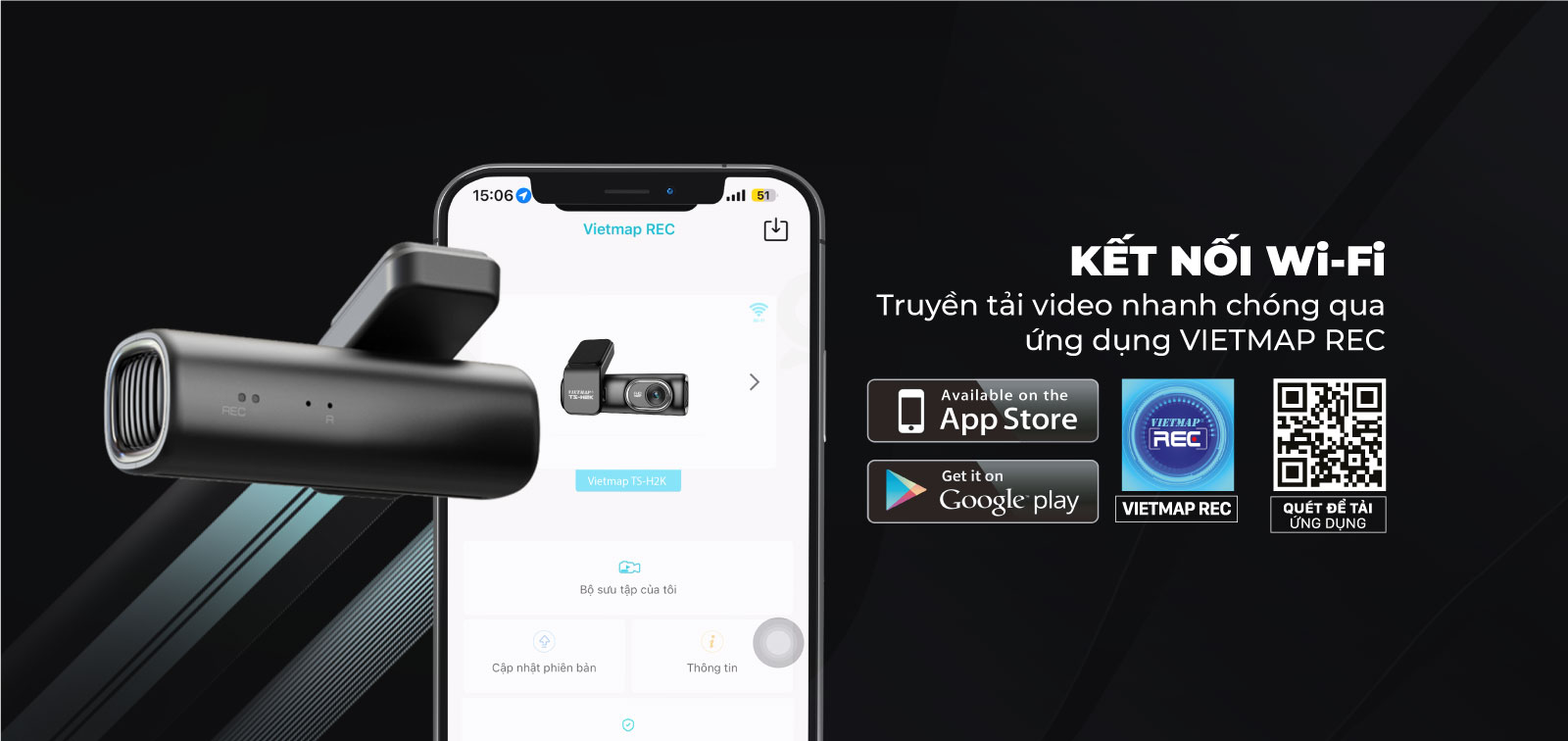Camera VIETMAP TS-H2K được trang bị công nghệ truyền dữ liệu thông qua kết nối WIFI không dây, giúp việc xem lại, lưu trữ chia sẻ video lên mạng xã hội dễ dàng trên các thiết bị hệ điều hành Android và IOS thông qua ứng dụng VIETMAP REC.